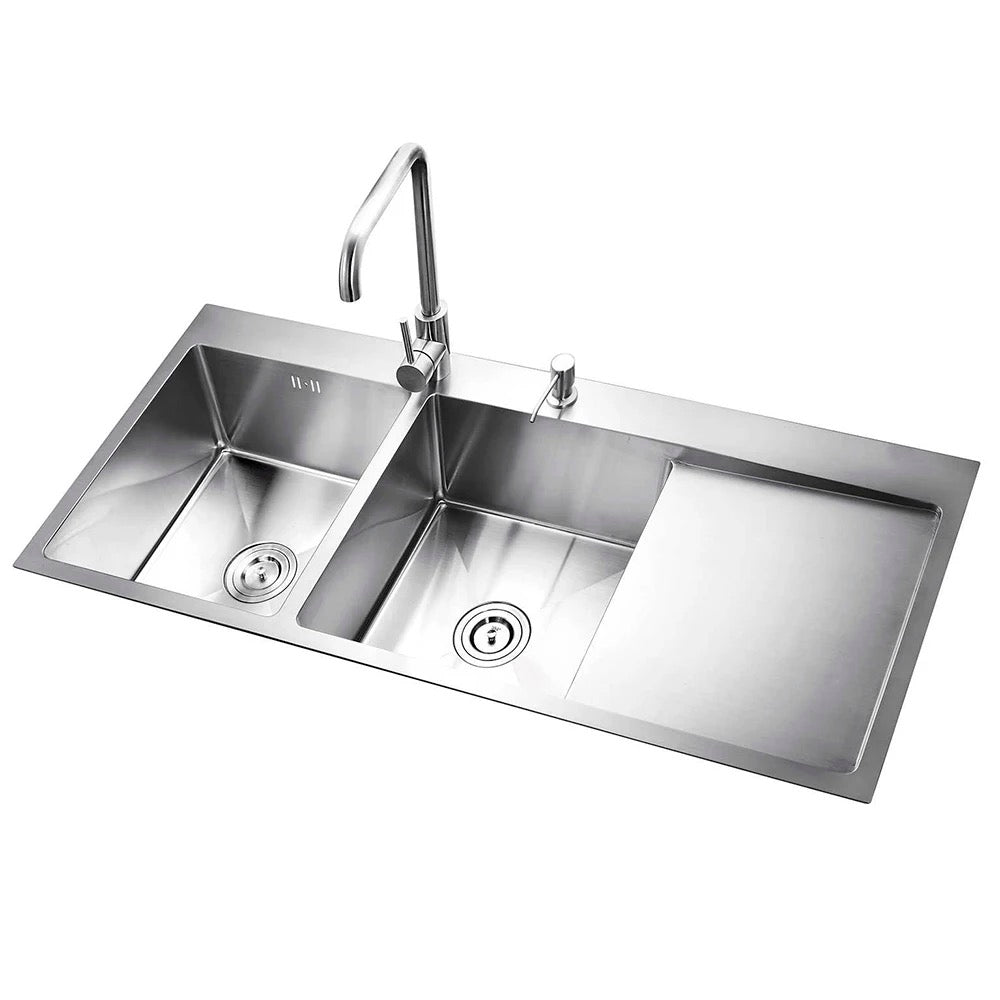 Modern stainless steel kitchen sink with two basins and integrated drainboard