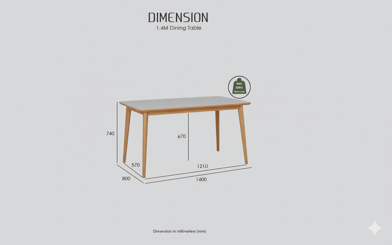 Bring timeless elegance to your dining area with the Charmant Dining Table – 1.4 m. Designed with sturdy Malaysian Oak legs and a smooth MDF tabletop finished with Veneer, this table combines durability with a sophisticated look. Its clean, minimalist lines suit Scandinavian, Mid-Century, or Modern interiors. The 1.4 m length comfortably seats 4-6 people, perfect for intimate family meals or casual gatherings.