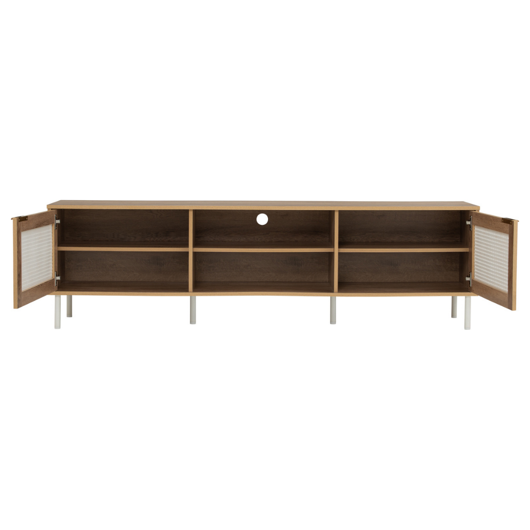 The Dallas TV Cabinet blends minimalist design with practical functionality. Available in Wotan Oak with white accents or Walnut with black accents, this console showcases natural wood laminated panels and striking perforated or rattan-effect door details. Two large storage cupboards and an open central shelving unit with two shelves offer ample storage for media devices, gaming consoles, and decorative items. Cable management holes in the open section help keep wires organized. Supported by matte metal legs in white or black, the Dallas TV Cabinet elevates your living space while making cleaning underneath easy.
