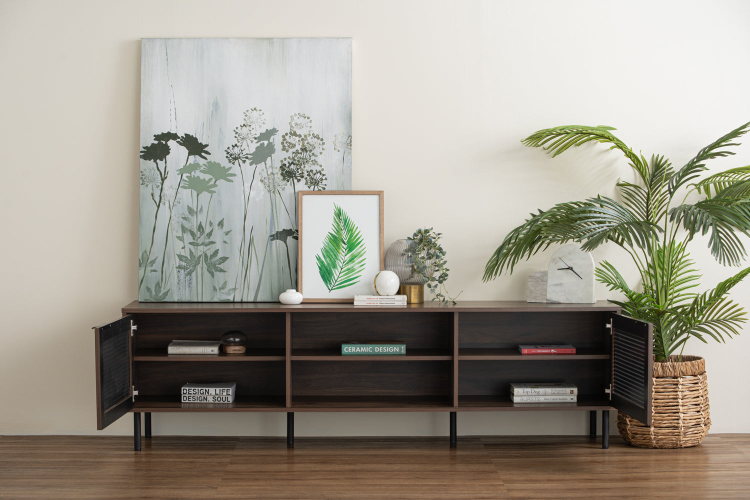 Modern Scandinavian-style TV console with storage cupboards and open shelving
