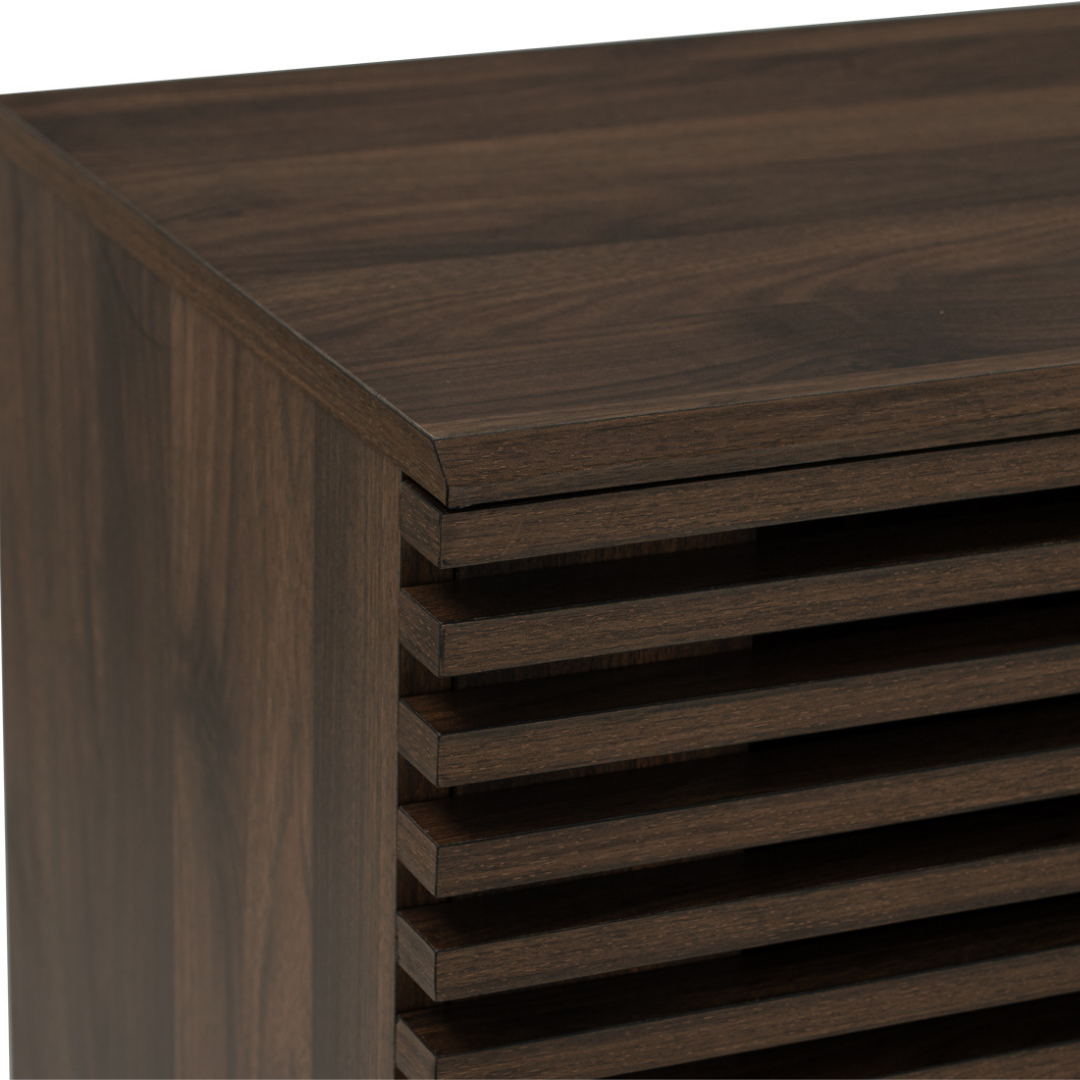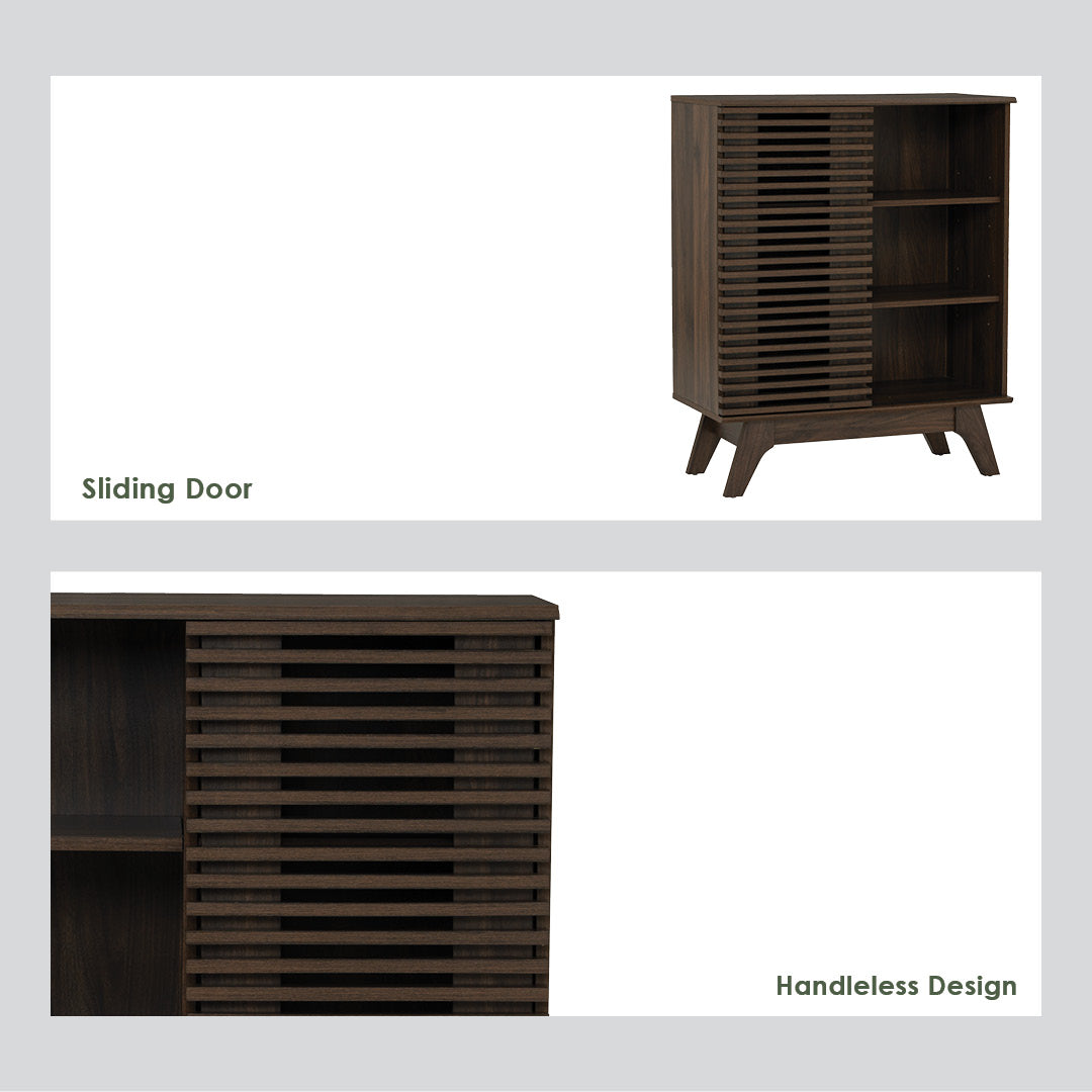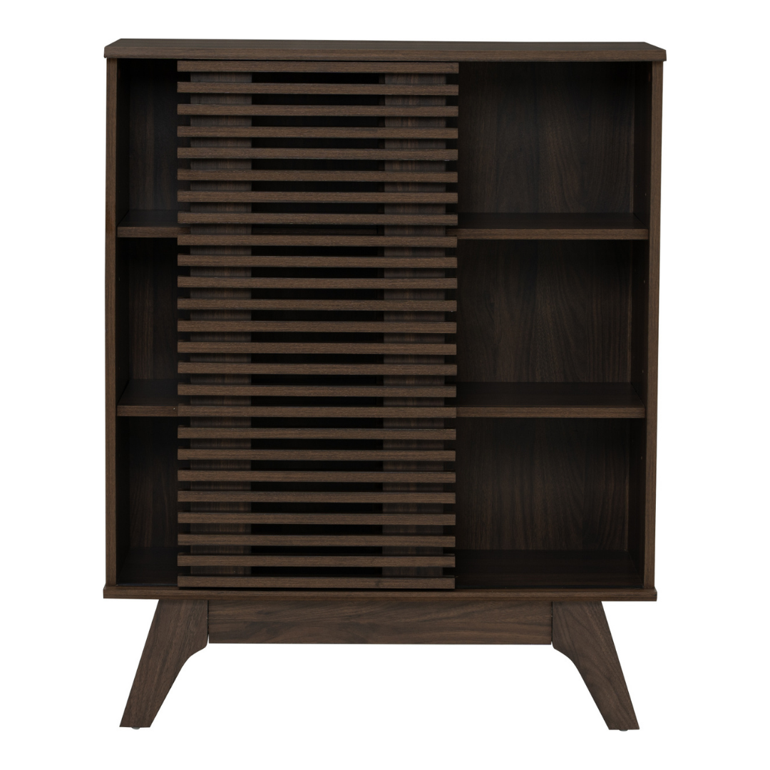 Walnut-finished mid-century modern cabinet with open shelving and sliding slatted door