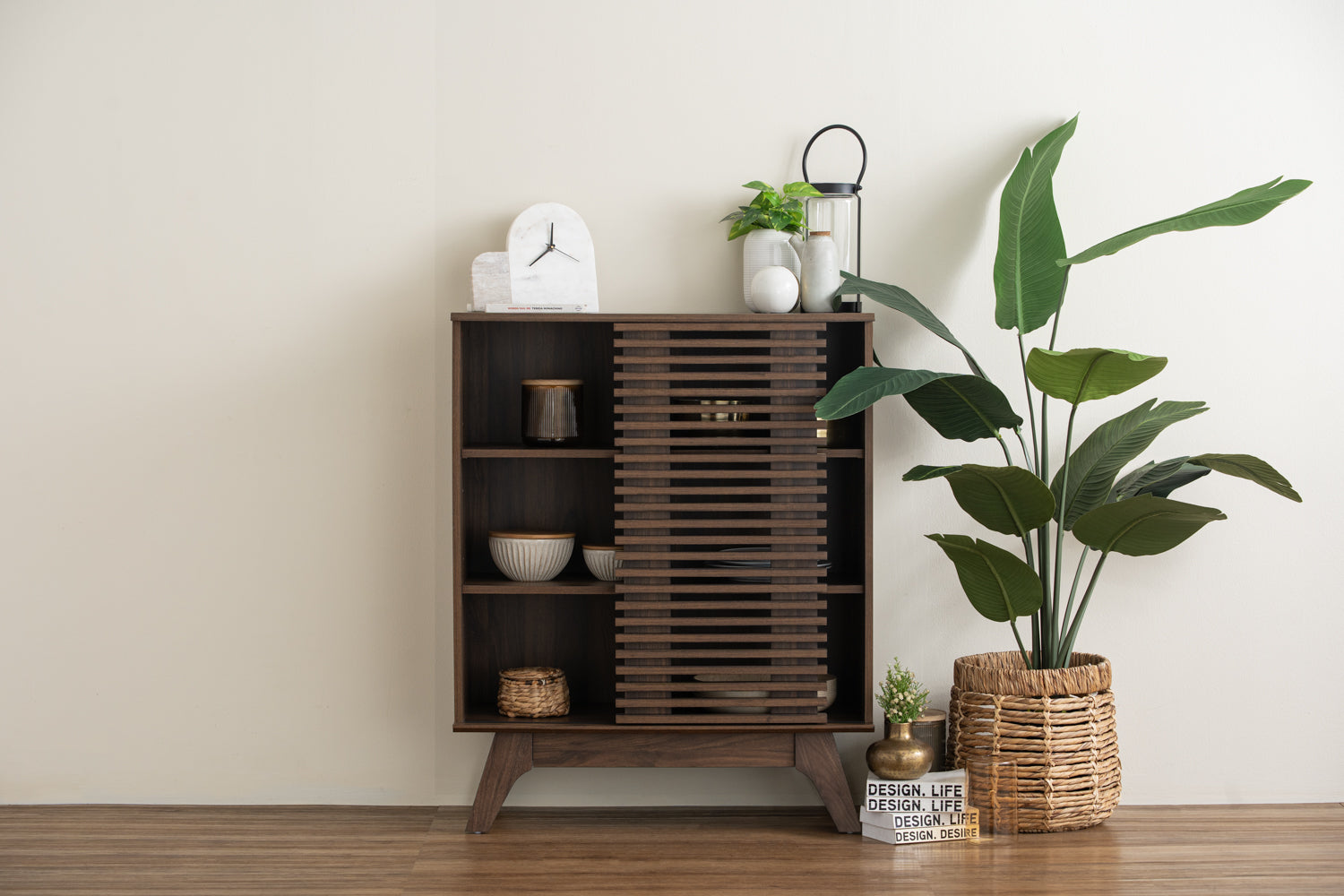 Its thoughtful design features open shelving on the left for books, décor, or collectibles, and a slatted sliding door on the right that conceals additional storage space. This blend of display and hidden compartments makes the Floro cabinet ideal for use as a display unit, bookcase, or general storage solution in living rooms, entryways, or offices.