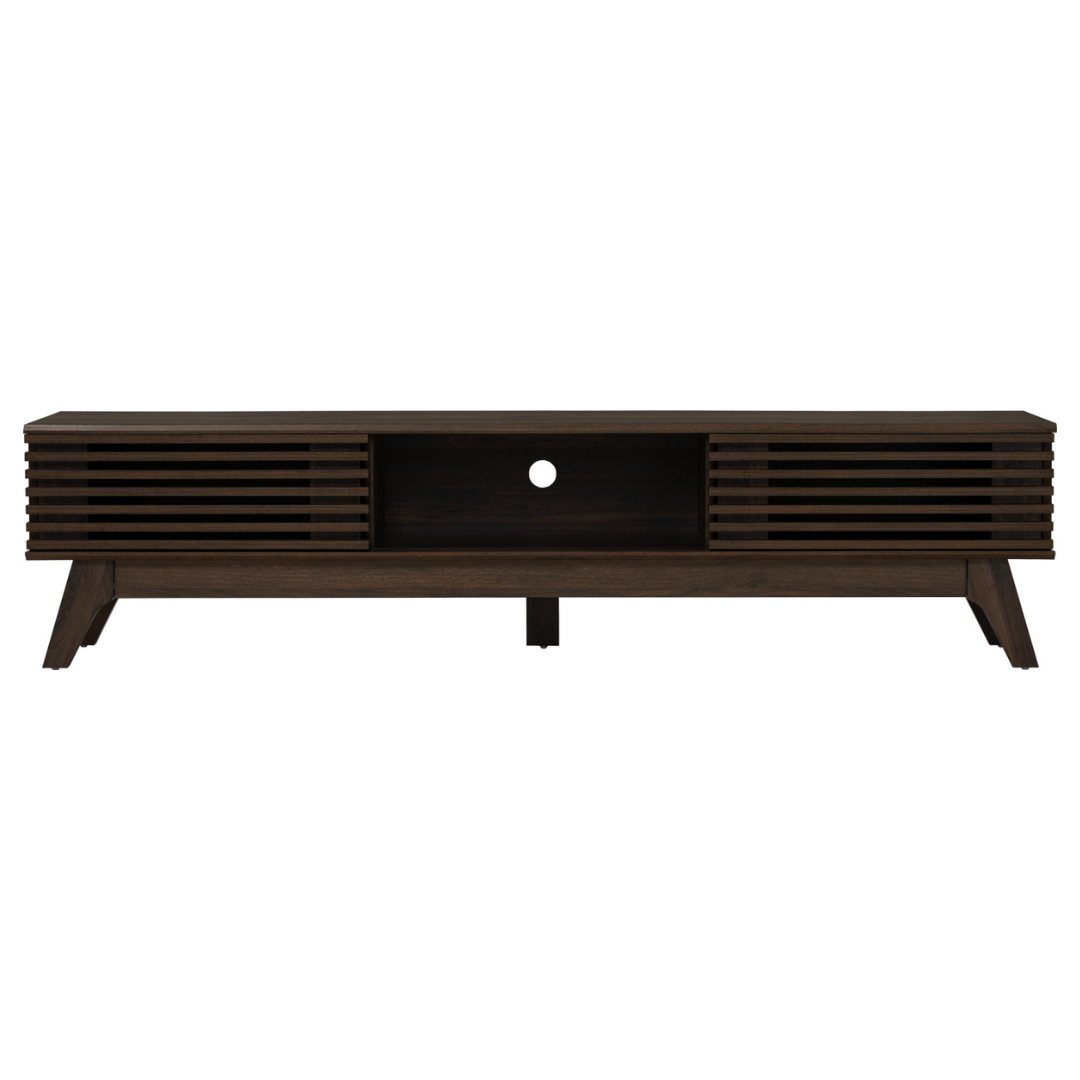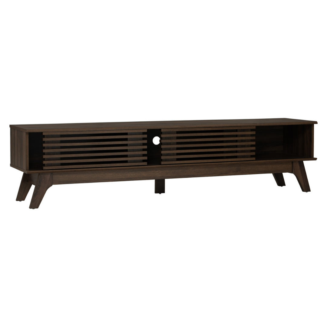 The TV cabinet features a central open shelf for media devices such as set-top boxes, gaming consoles and more, while two sliding slatted doors on either side provide concealed storage for games, or other living room essentials. Cable management ports in the open shelf help maintain a tidy setup, keeping wires organized and out of sight. Elevated on splayed legs, the Floro TV Cabinet enhances your space with both style and practicality.