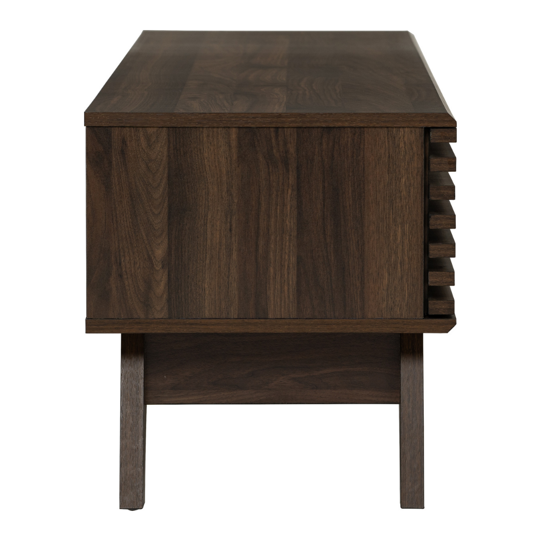Modern walnut wood-grain TV stand with sliding slatted doors and open shelving