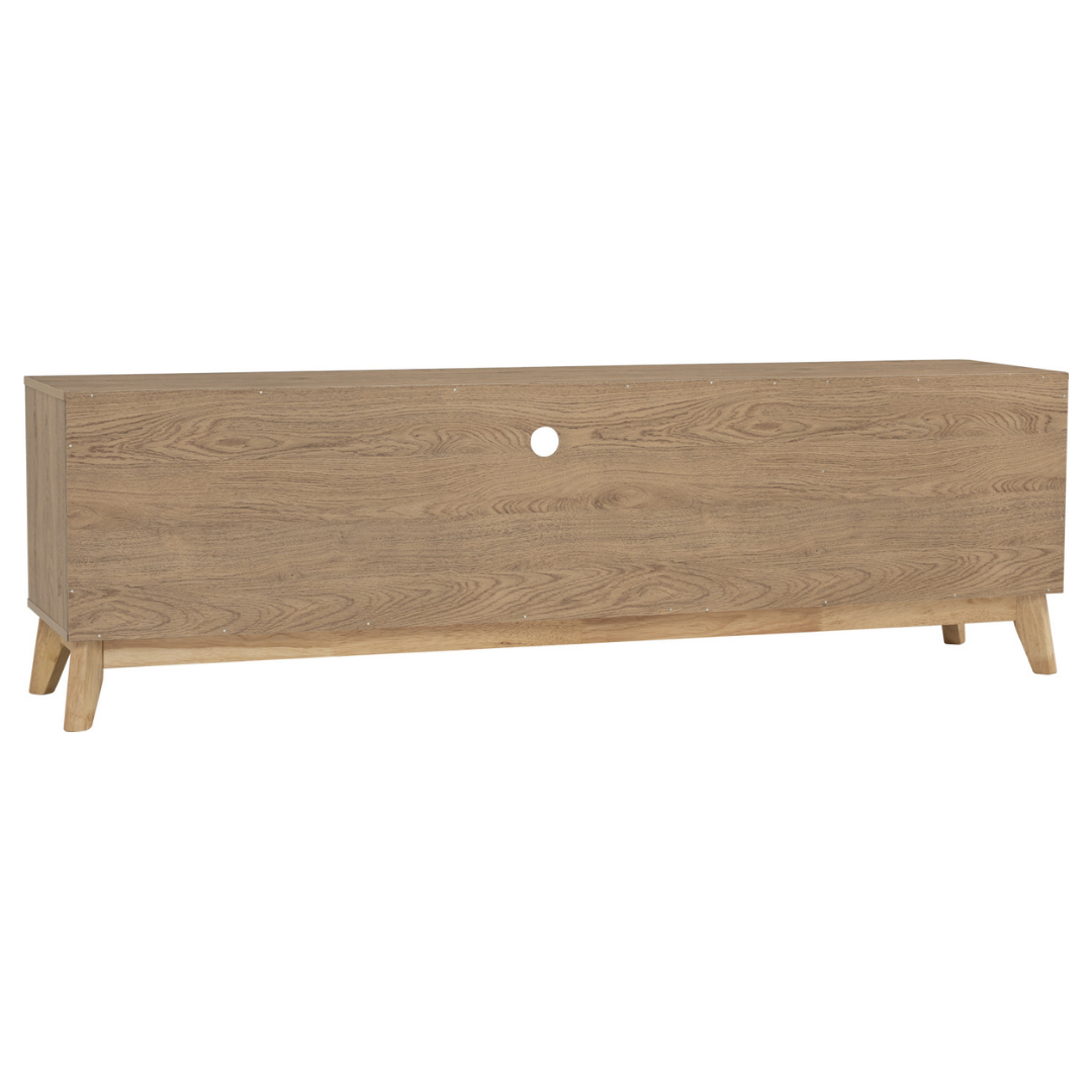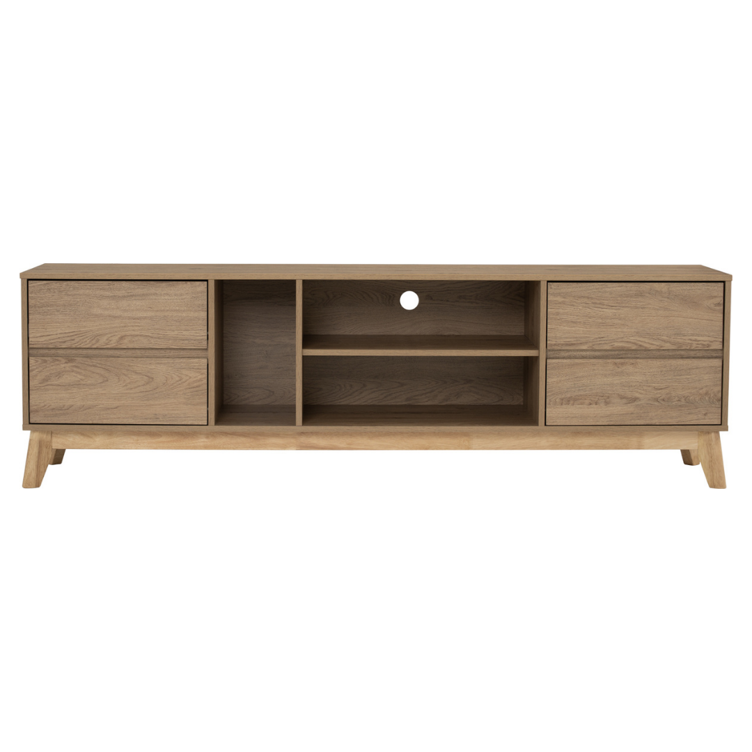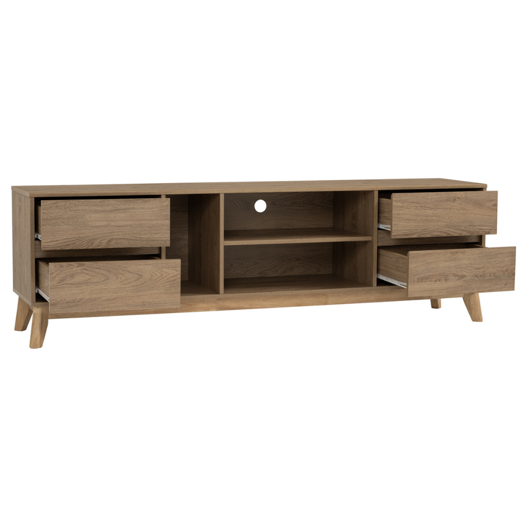 The cabinet provides ample storage with four sliding drawers and three open shelves, ideal for organizing media devices, gaming consoles, and decorative items. A pre-cut cable hole allows for neat wire management, keeping your entertainment area tidy. Designed to accommodate flat-screen TVs, the Hirado TV Cabinet blends functionality with timeless modern minimalist style.