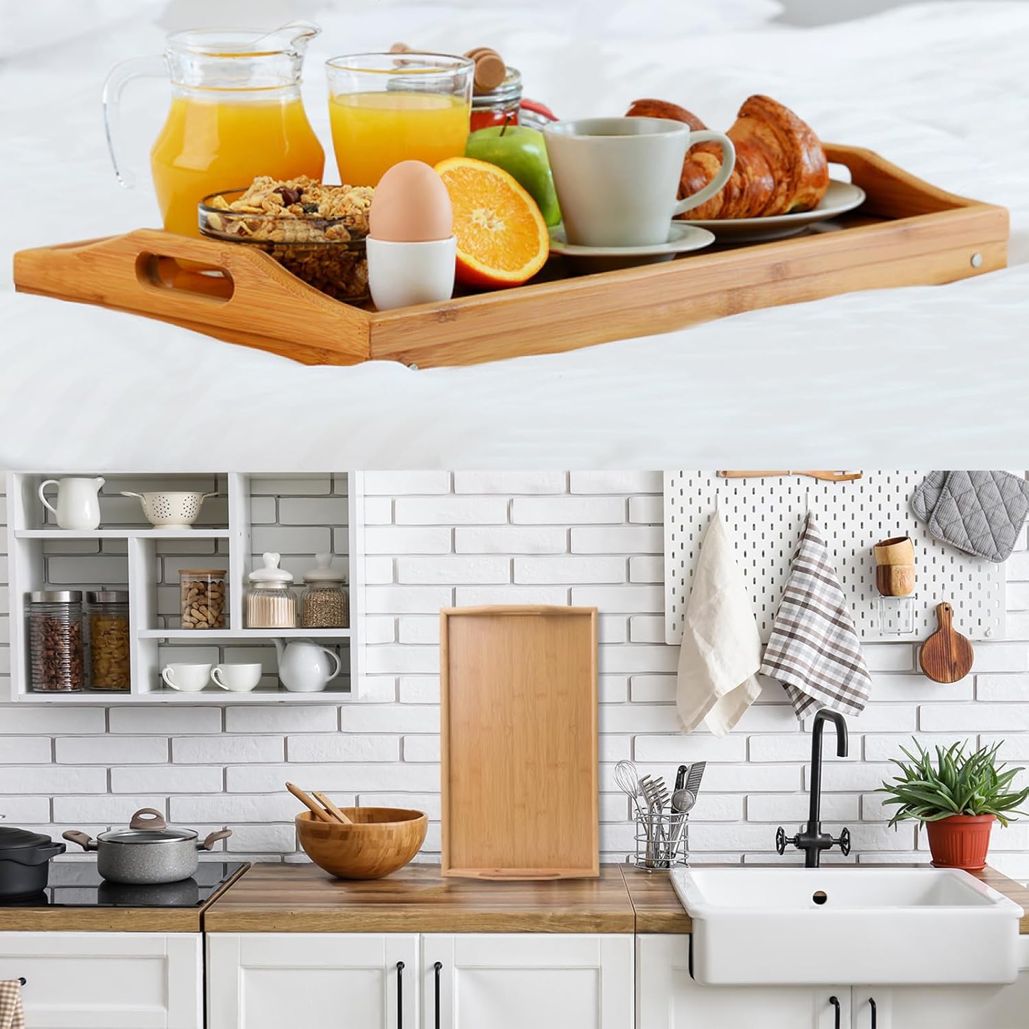 The tray features foldable legs that allow it to be used either as a raised serving table or flat as a conventional tray. Raised edges help prevent spills, while the built-in handles make it easy to carry from room to room. Perfect for meals, laptops, reading, or serving guests, this versatile tray brings convenience and charm to any home.
