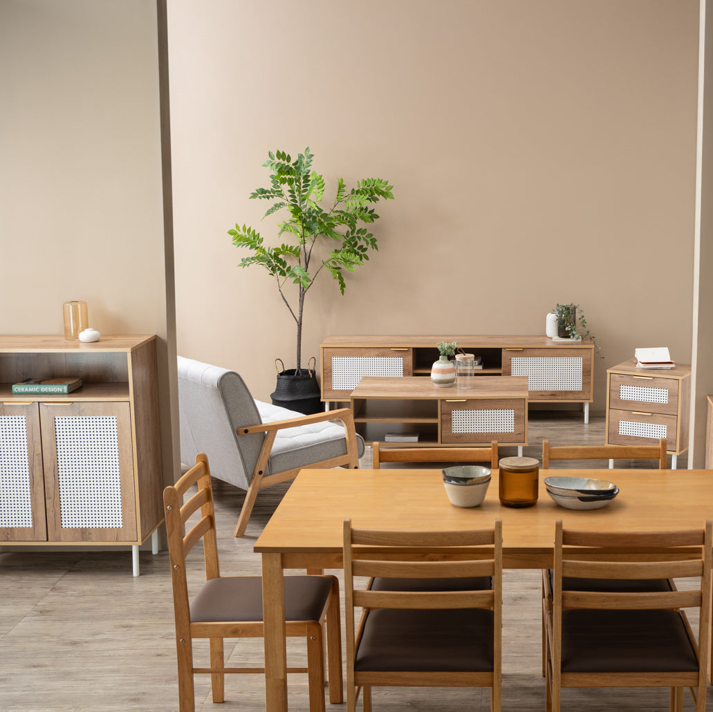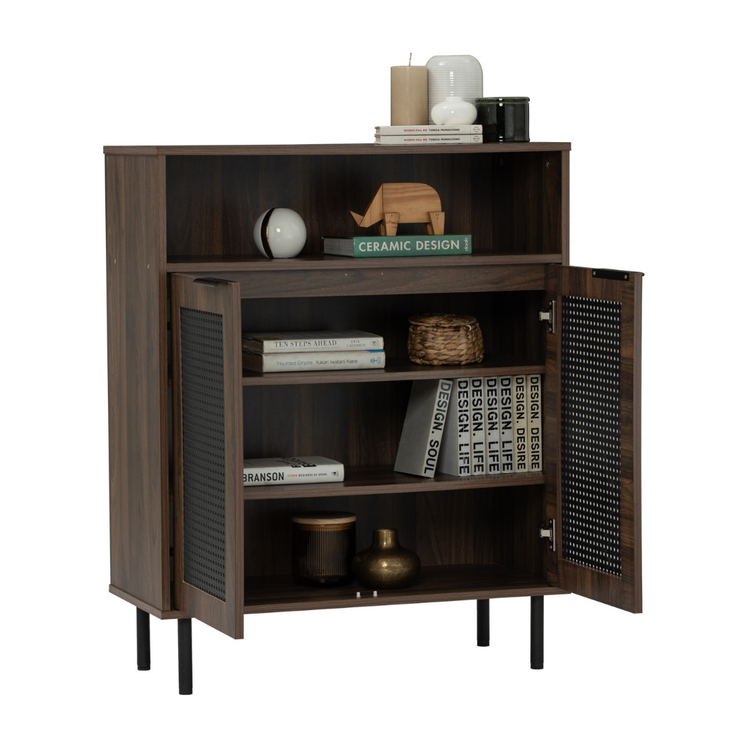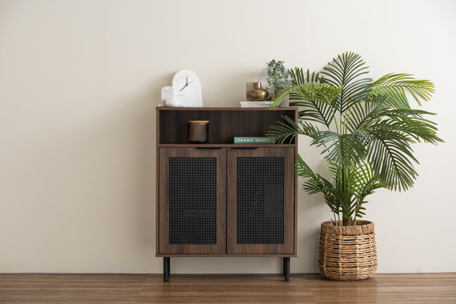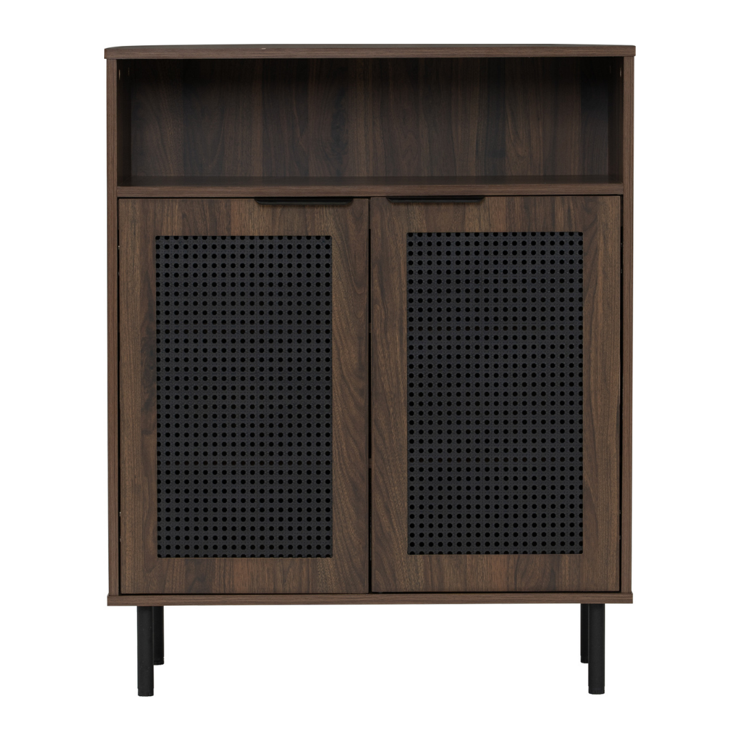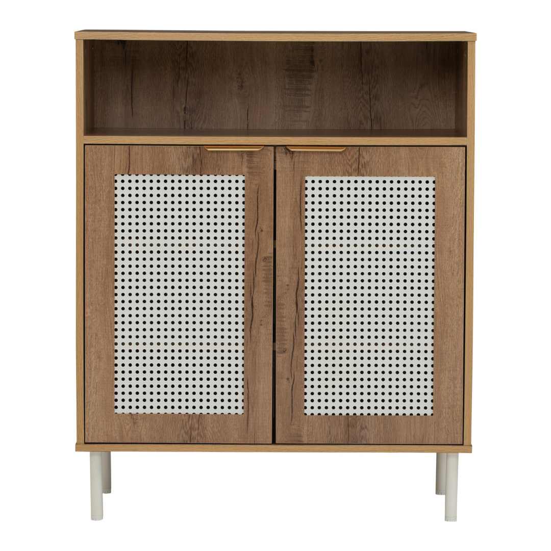 Designed with an open shelf at the top for quick-access items and two enclosed compartments below for organized storage, the Dallas cabinet is ideal for the living room, entryway, or office. Its minimalist lines, perforated or cane-effect door panels, and concealed handles give it a modern yet timeless appeal.
