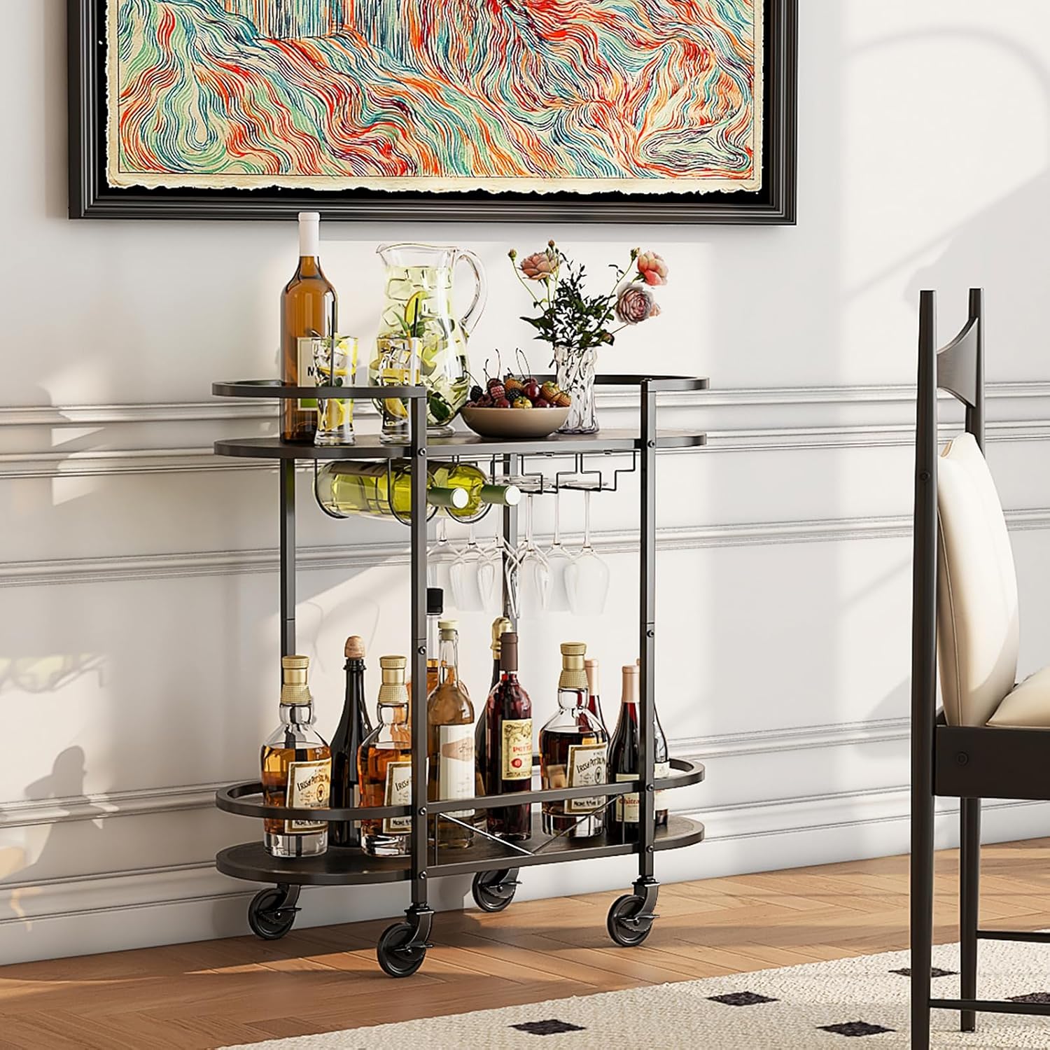 This dining cart combines practicality and modern design, making it ideal for serving meals, drinks, or storing kitchen essentials. It features two sturdy shelves for organizing items and a hanging rack under the top shelf, perfect for kitchen towels, utensils, or mugs. Equipped with smooth-rolling wheels, the cart can be moved effortlessly between rooms. Its sleek design and versatile functionality make it a stylish addition to dining areas, kitchens, or living spaces.