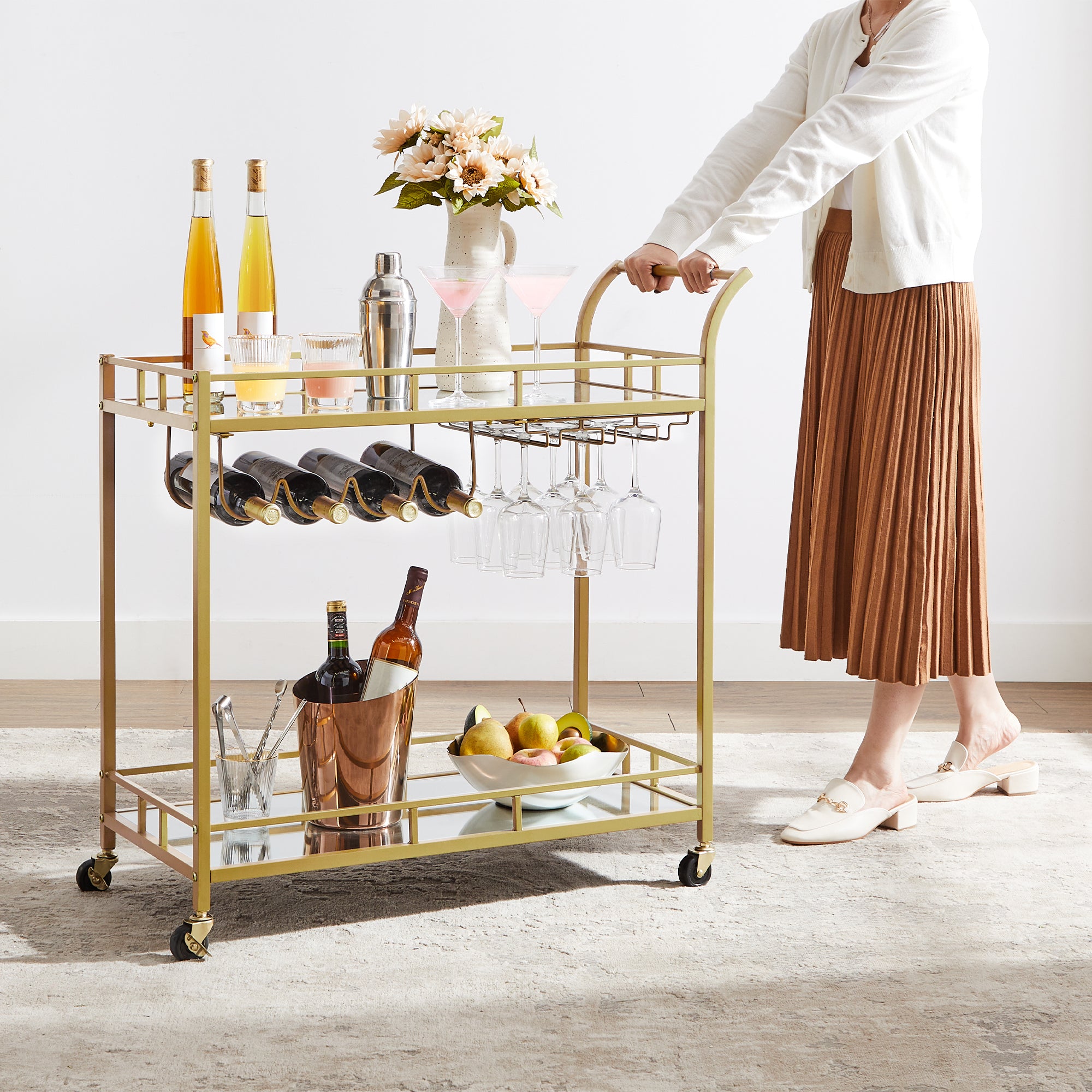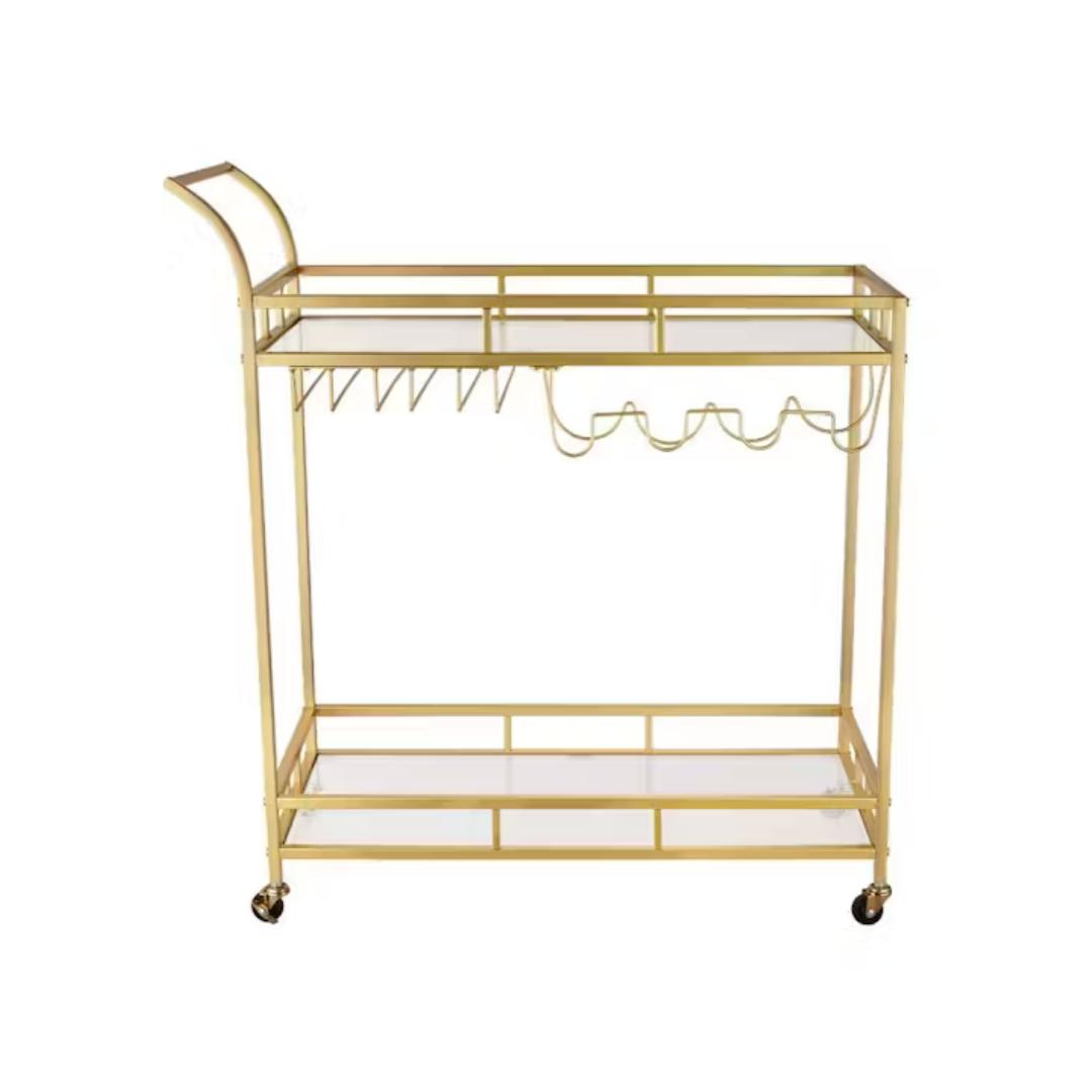 Gold bar cart with glass shelves and wine rack storage