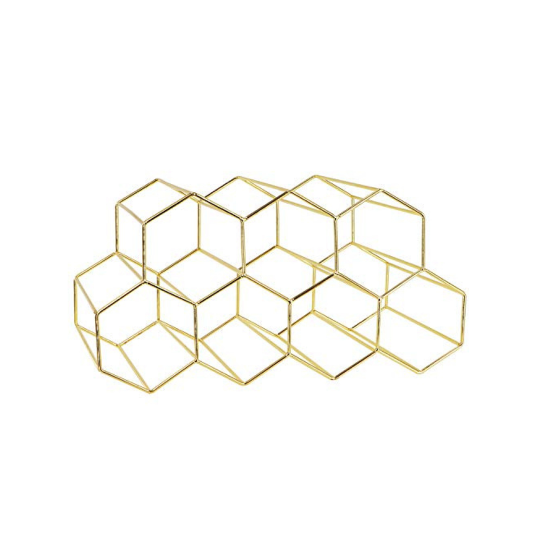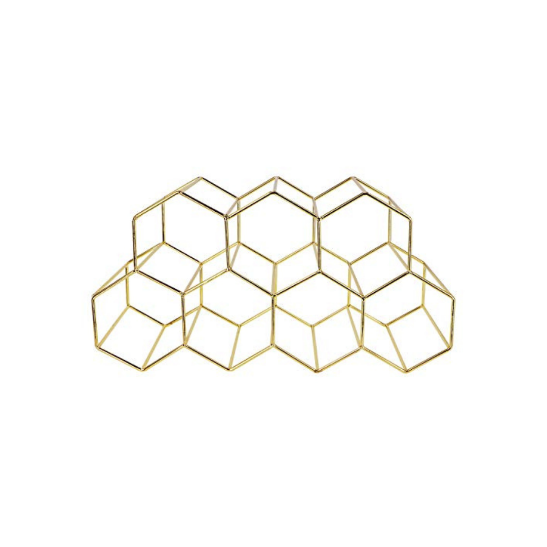 The Honeycomb Wine Rack combines geometric elegance with functional design, making it an eye-catching addition to any home. Crafted from durable metal with a polished gold finish, this rack features a series of connected hexagonal openings that form a honeycomb pattern. Each hexagon securely holds a wine bottle in a horizontal position, helping to maintain the wine’s quality while adding a decorative touch. Designed as a tabletop model, the Honeycomb Wine Rack is ideal for displaying your favorite bottles on a counter, sideboard, or bar area, blending modern style with practical storage.