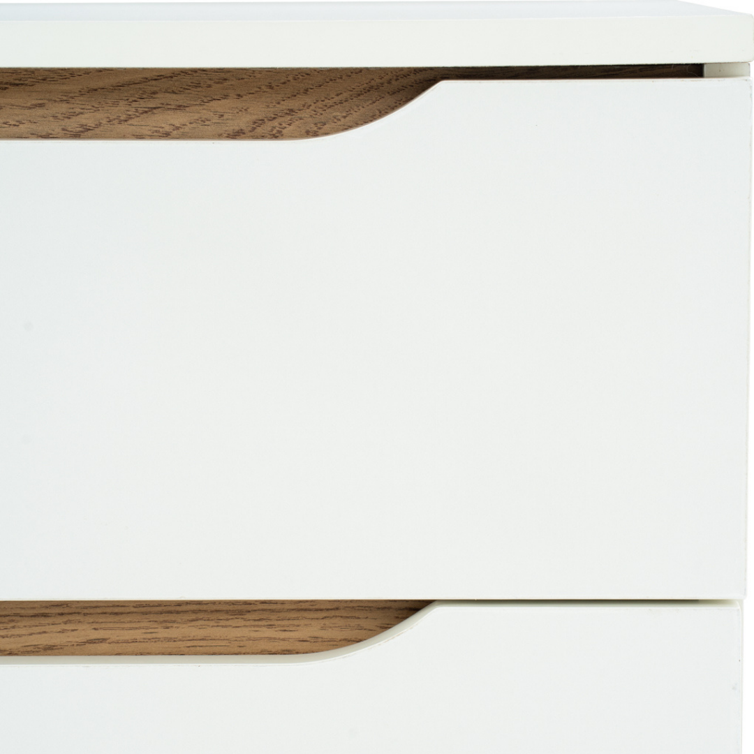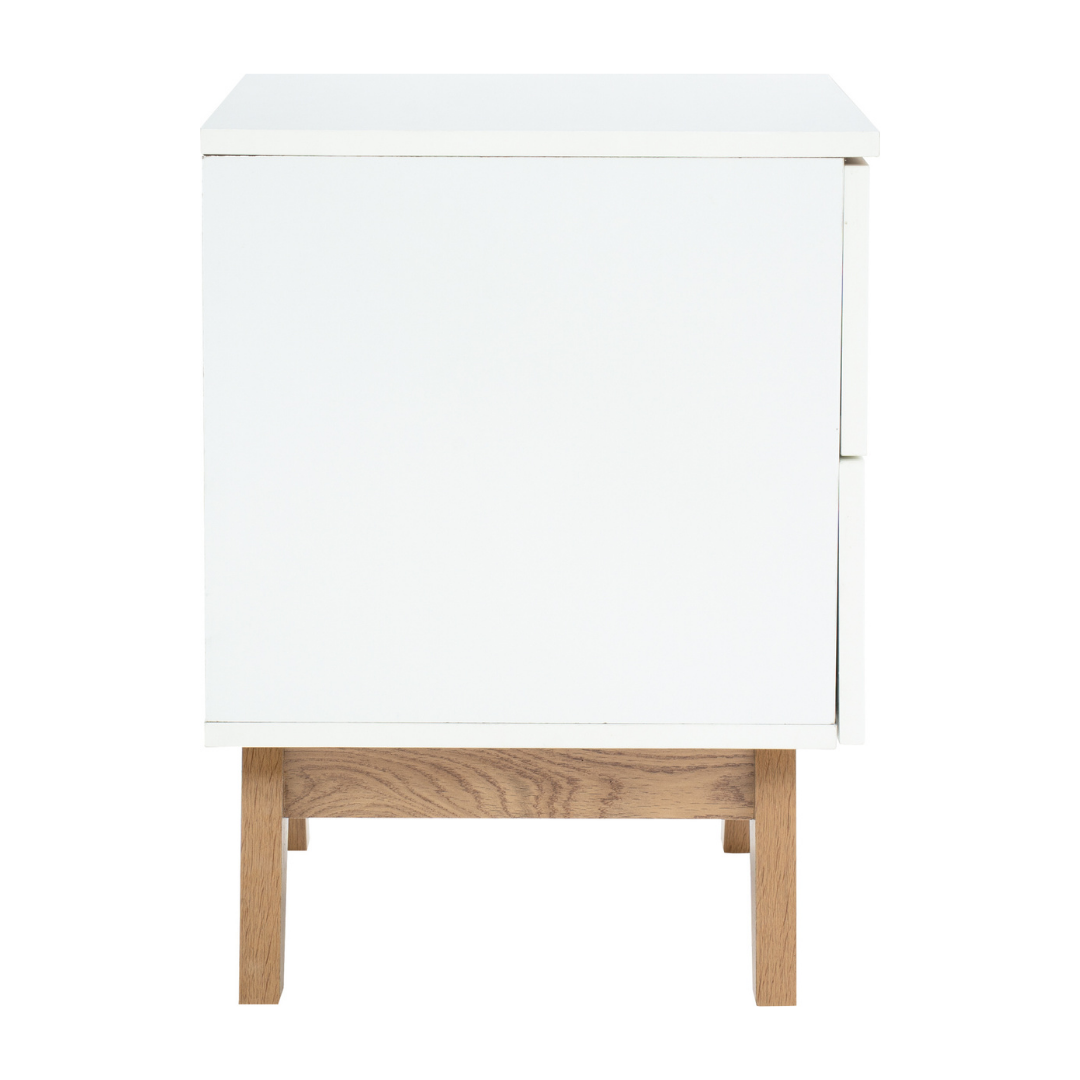 The Mando Side Table is a stylish and functional piece that brings modern simplicity to your bedroom or living space. Featuring a clean, minimalist design, it combines a crisp white finish with natural wood-toned legs, offering a contemporary yet warm aesthetic.