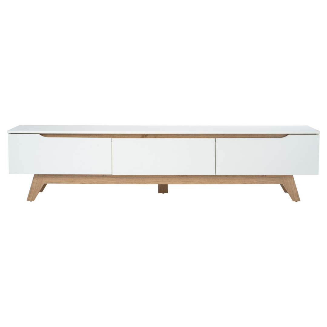 Crafted from engineered wood, this cabinet offers durability while maintaining a refined look. The spacious top surface is perfect for accommodating your TV, while the three handle-less drawers or doors provide ample concealed storage for remotes, media devices, and other essentials. Its angled wooden legs not only add a distinctive design element but also provide stability and easy floor clearance for cleaning.