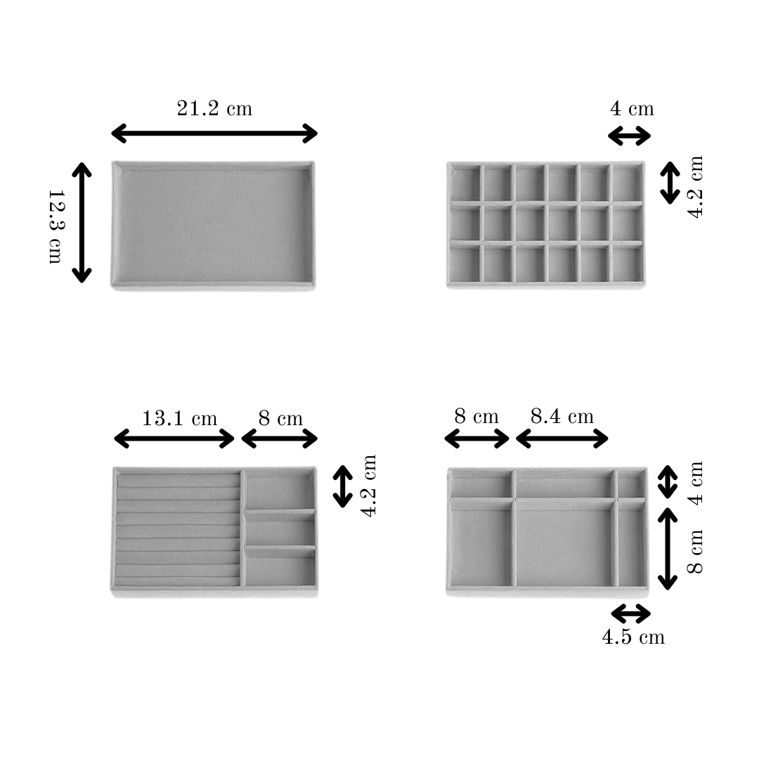 The Opal 4-Piece Jewelry Organizer offers a beautifully coordinated solution for keeping your accessories tidy, protected, and easy to access. Designed with clean, modern lines, this set includes multiple compartment trays that can be arranged inside drawers, placed on a vanity, or stacked to save space.