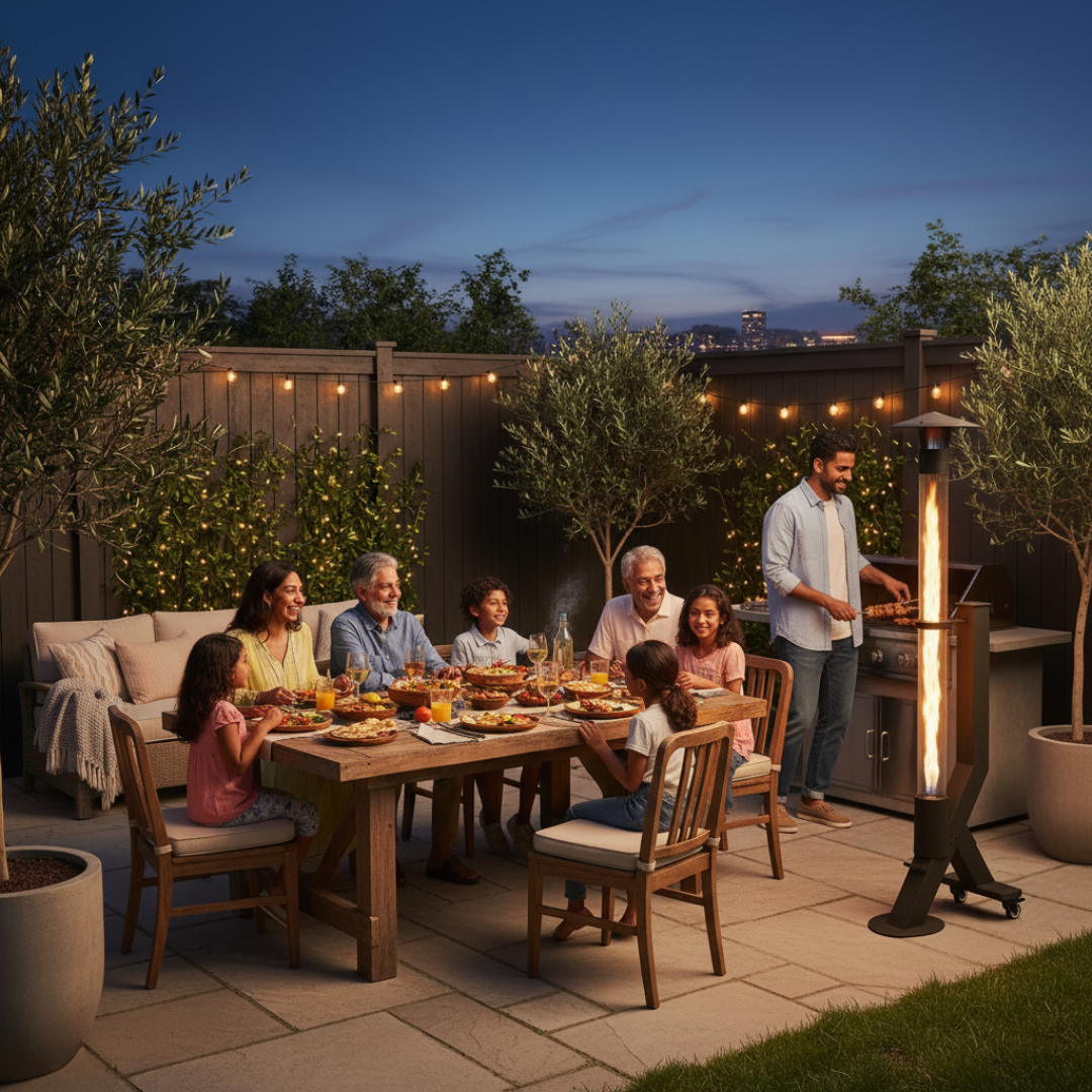 Outdoor heater powered by wood pellets for efficient, natural warmth