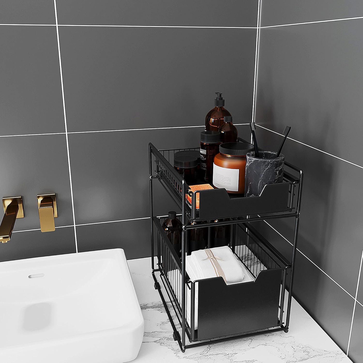 The Multifunctional Storage Rack is a versatile solution for keeping your space neat and organized. Designed with two sliding drawers, it provides easy access to items while maximizing storage in compact areas such as under sinks, on countertops, or inside cabinets. The open, ventilated design promotes airflow and prevents moisture buildup, making it ideal for kitchens, bathrooms, or laundry rooms. With its durable frame and modern look, it combines practicality with clean design for everyday organization.