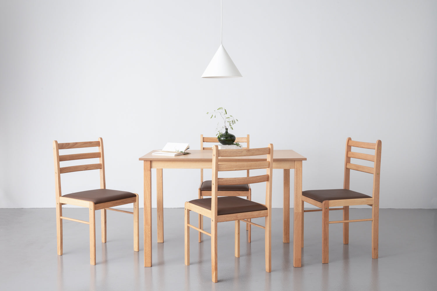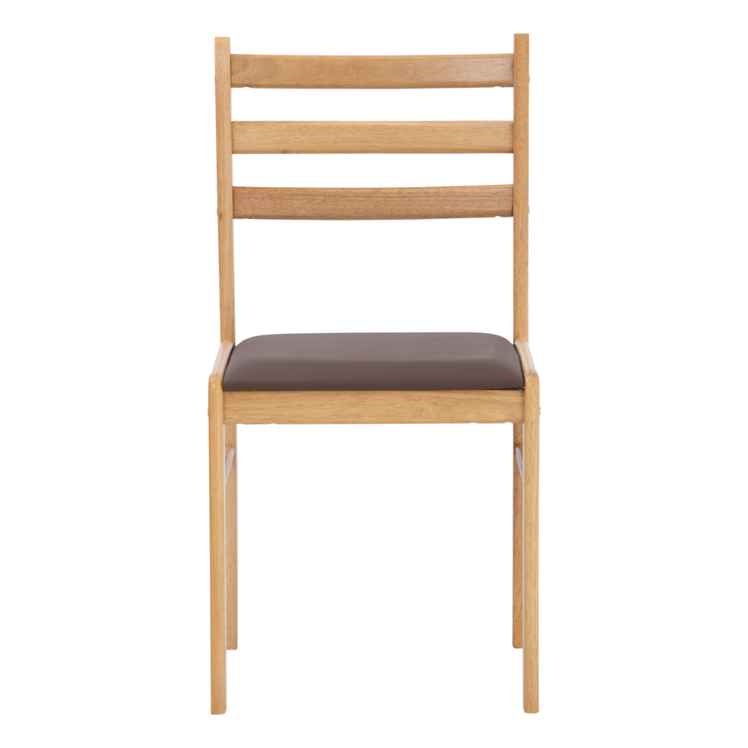 The square dining table features sturdy Malaysian oak legs and an MDF veneer top, offering both durability and a timeless look. Complementing the table are four matching chairs, crafted from Malaysian oak with a ladder-back design for support and mocha vinyl padded seats that add comfort and a subtle contrast to the wood tones. Whether placed in a dining room, kitchen, or apartment setting, the Wald Dining Set brings elegance, comfort, and functionality to your meals and gatherings.